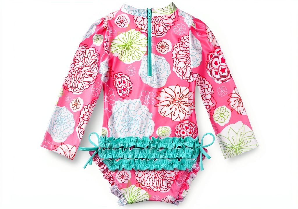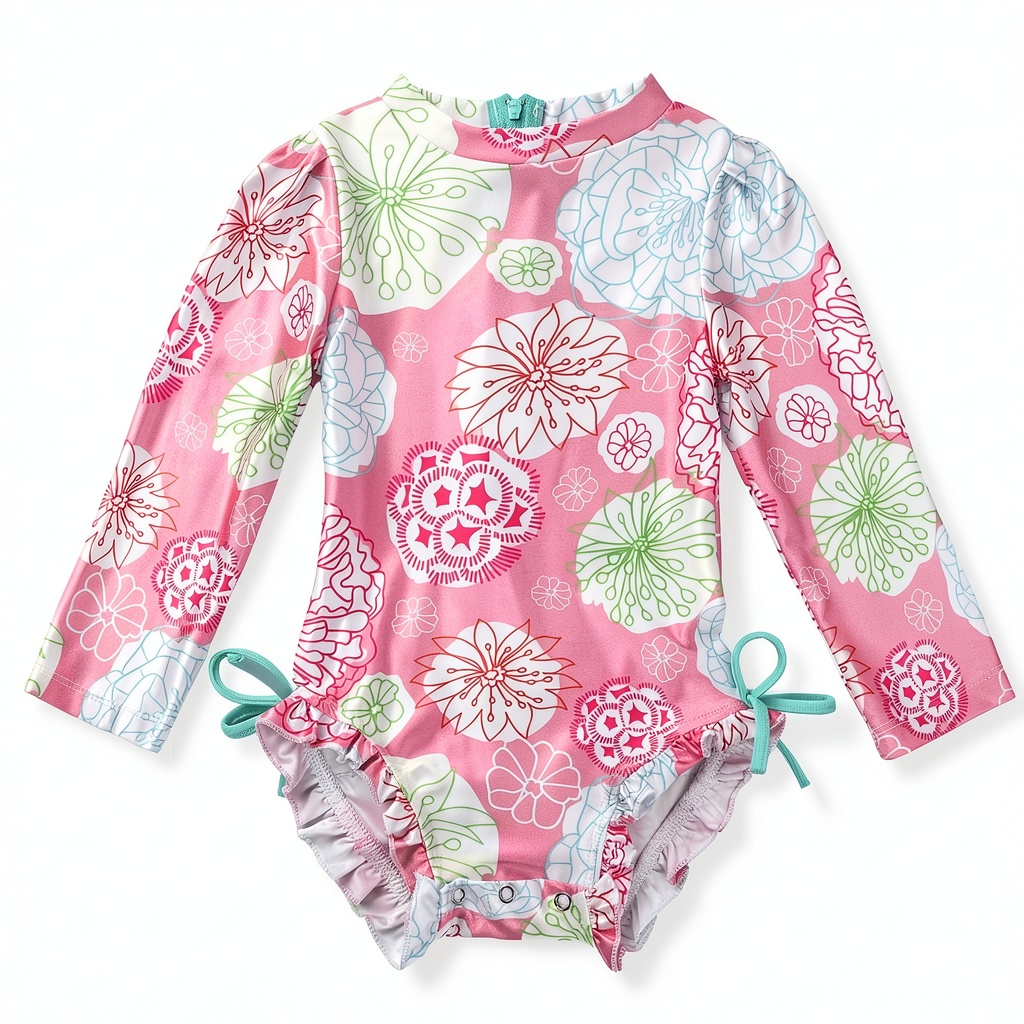 This swimsuit is ideal for baby girls engaging in water-based activities such as swimming, surfing, bathing, and beach wear. Its stretchy, breathable material makes it suitable for warm weather outings, pool parties, or family vacations. The long sleeves offer added protection from the sun, while the zipper design simplifies dressing for active toddlers. Target audience includes parents seeking reliable, fashionable swimwear for infants and young girls aged 3-6 months or 6/7, ensuring a comfortable fit during play and relaxation.